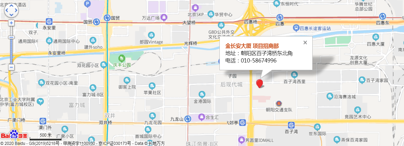 金长安大厦http://www.bjlvdizhongxin.cn简介: 金长安大厦位于位于北京市朝阳区百子湾路16号,长安街沿线,四惠桥东南角,东 四环与百子湾路的交汇处。大厦高99.9米,顶部指天针高137米,具地标性,从金长安大,向长安街俯.,CBD繁 华景观尽收眼底!项目占地面积10万平方米,建筑类型为纯写字楼和商务楼。产权是由开发商整体持有,对外租 赁的甲级写字楼综合体。由两栋写字楼(A座16层、C座32层)、一栋酒店(B1座15层)及与A、C座标性业裙楼(B2 座5层)构成。 一至三层是商业,四层以上是写字楼,商业和写字楼的出入口是独立的,写字楼拥有500平米的豪 华大堂。局部挑空10米,周边绿化率高,地上地下车位充足。电梯配比率1:2。3.4至4.0米办公层高,框架结构 提供提供多选的面积组合,在顶层提供创新跃层式办公面积,全新6.8米双空间,将企业的空间尺度全面放大。 金长安大厦纯商务功能的定位,完全继承了CBD以“商务定位为主”的整体开发理念。