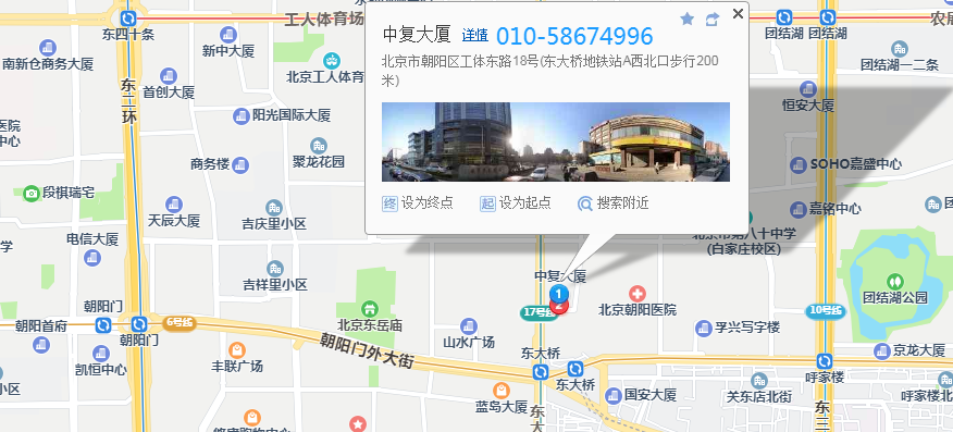 中复大厦稳坐东大桥十字路口东北角,占据着地标性的绝佳位置。与第一使馆区、国贸商圈近在咫尺。中复大厦为北京著名手机连锁零售企业中复电讯的总部大楼。