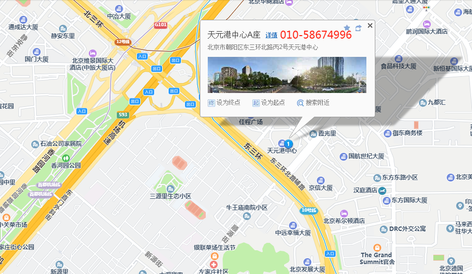 天元港中心为甲级5A商务写字楼,位于北京市朝阳区三元桥东北角,东三环北路和宵云路相交的位置,是首都机场、东三环和北三环三个方向的城市视觉中心。北京市东北三环路集中了国展中心、南银大厦、燕莎、凤凰城、希尔顿饭店、长城饭店、昆仑、国贸等诸多商务场所,是北京市重要的外事及商务活动区。